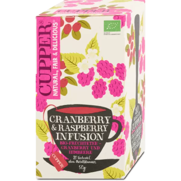 A Cupper Bio Gyümölcstea Vörösáfonya & Málna bio koffeinmentes gyümölcstea természetes alapanyagokból készült. Ez a csodálatosan frissítő keverék ötvözi az áfonya csábító savanyú ízét a málna intenzív édes ízével. A Cupper teák előállításához a legmagasabb minőségű bio és fairtrade alapanyagokat használják fel.