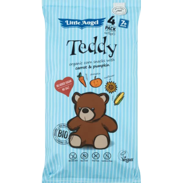 Újdonságunk Teddy, gyönyörű csomagolásban, aranyos formájú egészséges nassolni való! Extrudált kukoricás bio snack répával és sütőtökkel, hozzáadott cukor és só nélkül készül.